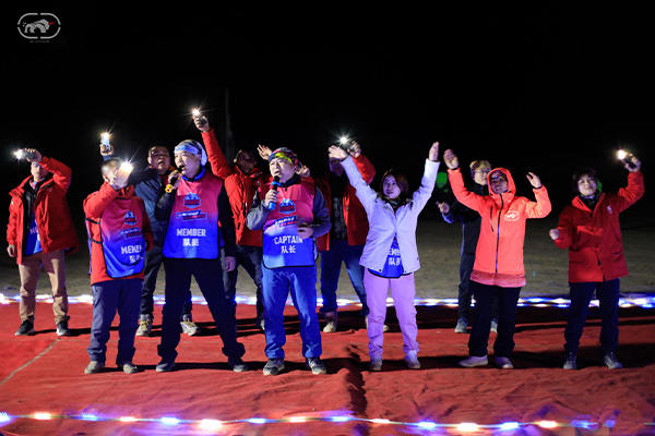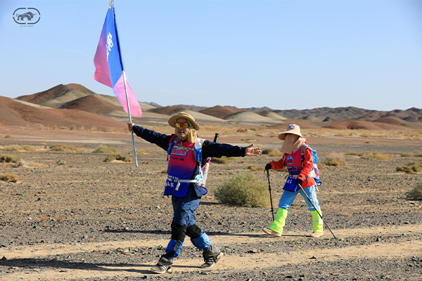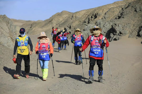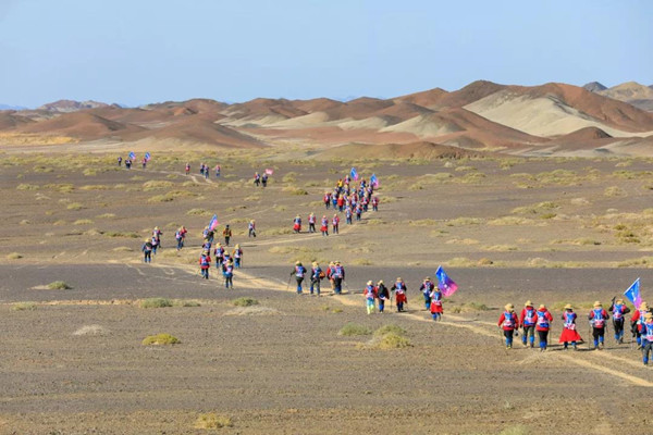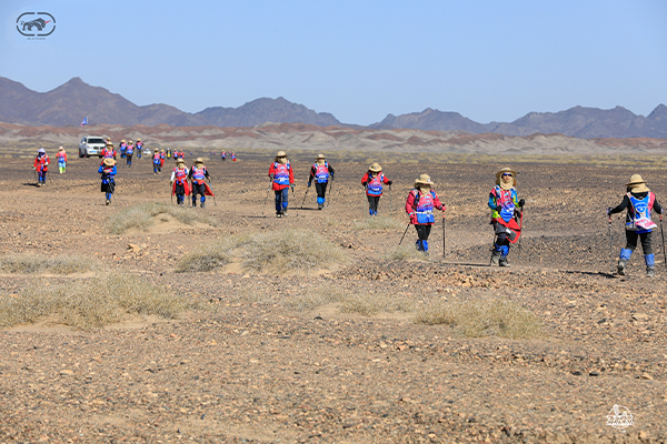 第一天是8小時(shí)25公里,牛商們在太陽還沒完全升起來就開始了遠(yuǎn)征前的熱身,原力專業(yè)的教練,激昂的樂章,鼓舞著雄心勃勃的牛商們,一聲號(hào)令全體出發(fā),萬馬奔騰的節(jié)奏開始了,彩旗飄飄,紅裝戰(zhàn)衣,藍(lán)色背包,熒光粉的名號(hào)牌,浩浩蕩蕩,塵土飛揚(yáng)!戈壁我們來了!