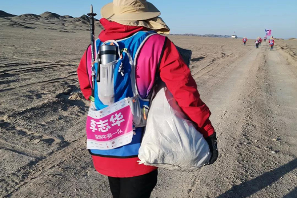 一路上走來,那是最美的照片,當(dāng)我們步履蹣跚的時(shí)候,深圳的李志華他抱著纖維袋,一路撿垃圾,走過的路他一共撿了17袋垃圾。蒼穹之下戈壁中人是何等的渺小,這一個(gè)小小的舉動(dòng)卻又是多么的高大,讓人敬佩感動(dòng)!