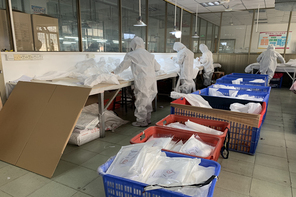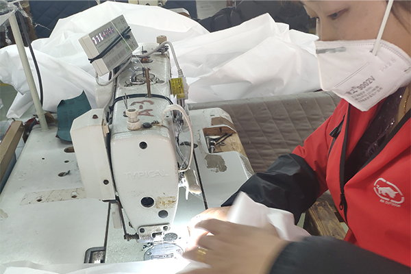 做好上面的防護準備工作,員工(身體狀況良好的)也可以放心的來到工廠上班了,現在思諾華制衣的員工也已經陸陸續續的來到工廠,全力開展生產防護服,抗擊疫情,隔離病毒但不隔離愛,請觀看以下思諾華制衣工廠實拍生產民用防護服的圖片(員工均佩戴口罩、身體狀況均良好):