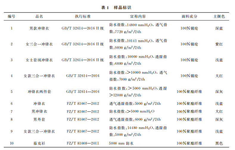 分別從實體店和網絡平臺購買中端品牌的沖 鋒衣,不同品牌10件,價格區間在1000元左右。 其中 執 行 標 準 標 示 了 GB/T32614—2016 的 5 件,未標示 GB/T32614—2016而宣稱有防水性 能和/或透濕性能的5件,詳見表1。