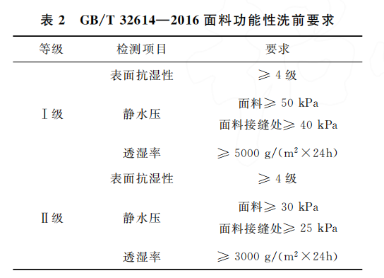GB/T32614—2016《戶外運動服裝 沖鋒衣》 標準依據沖鋒衣的功能指標對其進行了級別劃 分。I級產品的防水透濕要求最為嚴格,適用于 專業戶外活動;II級產品相對I級產品的防水透 濕指標稍低,可滿足日常的戶外休閑等活動。對 于劃分I級、II級的功能性指標,應在吊牌中標注 “I級”或“II級”,不標注的均視為I級產品。面料 功能性又分洗前和洗后要求,本文考慮了樣品成 本和比較目的達成兩方面的原因,只測試和比較 面料功能性洗前要求,見表2。