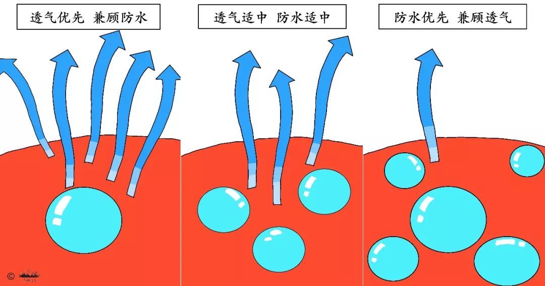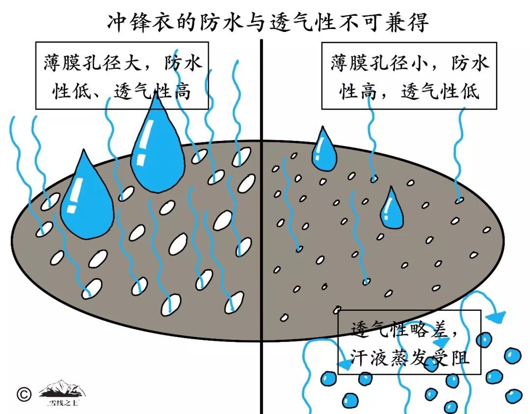 防水性越高,透氣性越弱——這是因為沖鋒衣的防水和透氣都是利用同一通道——薄膜微孔。在厚此薄彼之間就造就了兩者之間的矛盾:提高防水性,就需要讓薄膜微孔更小、更密,就越不利于汗水蒸發排出。因此,沖鋒衣的防水性越高,透氣性越弱,反之亦然。