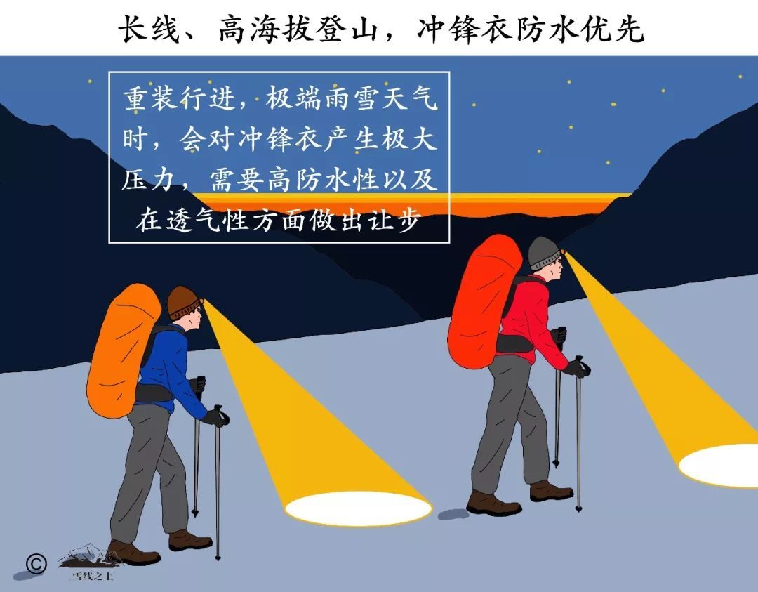 沖鋒衣的防水性與透氣性不可兼得,你在選購時,就不能指望買一件“全能型”沖鋒衣,而應該根據自己的戶外活動類型來平衡。