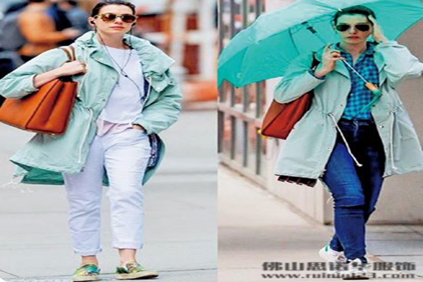 超大碼的沖鋒衣如果搭配不好就會顯得過于臃腫,那么一定要記住上寬下窄的原則?!岸炭?高腰”是永遠不可拆散的好搭檔,瞬間可以把上下身比例拉成3:7,同時記得選擇沖鋒衣時,也要get住這一點哦,拒絕合身形的,大大的版型才是王道,下身要搭配利落的小腳褲才有型,避免過于臃腫肥大的搭配。如果這時再踩一雙有跟的踝靴,你就是街拍的焦點。將領口拉大,秀一把鎖骨。當然如果下身搭配超短褲露出大長腿,也可以達到拉長身形的效果。