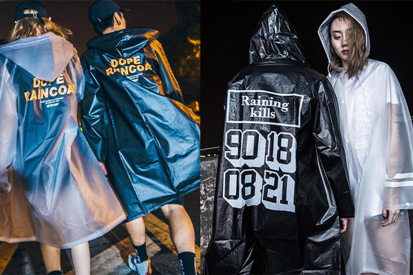 這是滿常見的一款,但同時也是最具風格性的。在普通的穿搭,只要套上透明雨衣式的沖鋒衣,都可以化腐朽為神奇!利用內搭上衣來避免撞衣的窘境,如圖左整套式的透明搭配,以頭跟腳的黑色配件來強化對比;圖右則是在亮橘色的衛衣外,罩上透明黑邊的沖鋒衣,點亮了原本較單調的穿搭;圖中的下身選擇簡單的五分短褲,加以凸顯上半身的半透明沖鋒衣之特色。