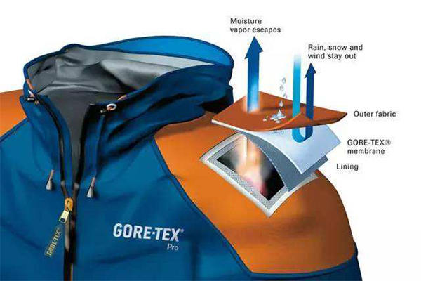 (1)一種是EPTFE復膜的微孔型面料,目前國內多是GORE-TEX、DENTIK、EVENT、3TO1-TEX這幾種。它防水透氣的功能是在服裝的外面料上復合一層微孔薄膜,其中的微孔比水滴分子小,又比氣體分子大,可以在阻擋雨水的同時揮發自身的汗氣。