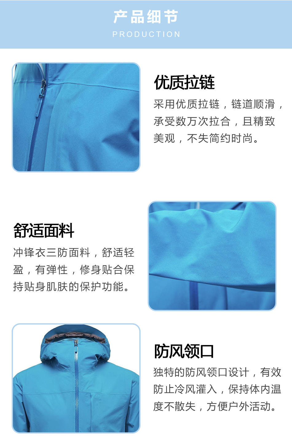 舒適面料沖鋒衣加工使用三防面料,舒適輕盈,有彈性,修身貼合保持貼身肌膚的保護(hù)功能。