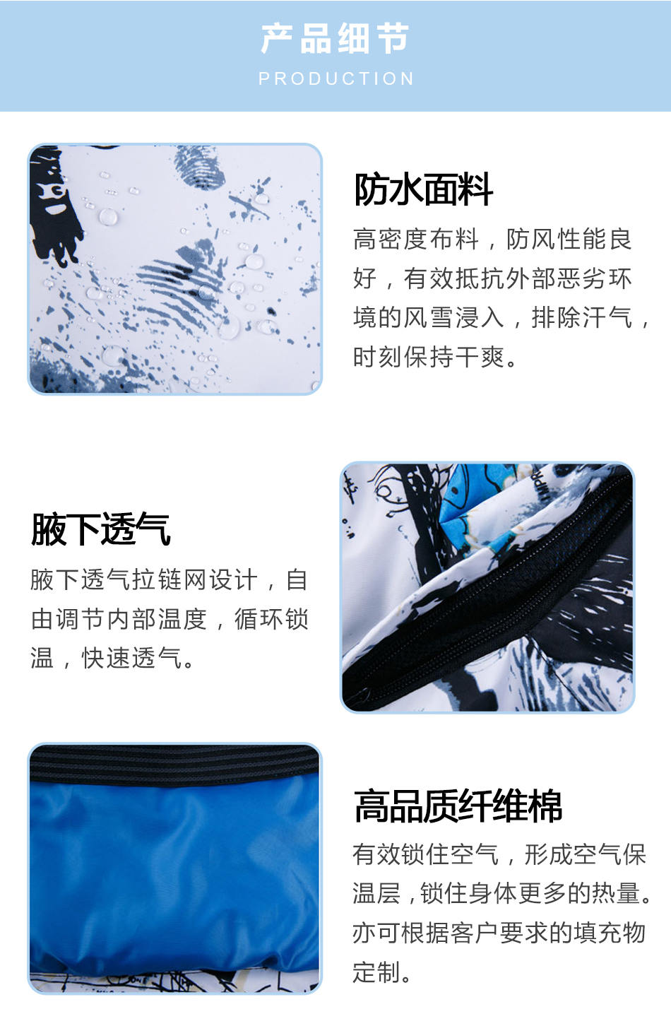 高品質纖維棉:有效鎖住空氣,形成空氣保溫層,鎖住身體更多的熱量。亦可根據客戶要求的填充物定制。