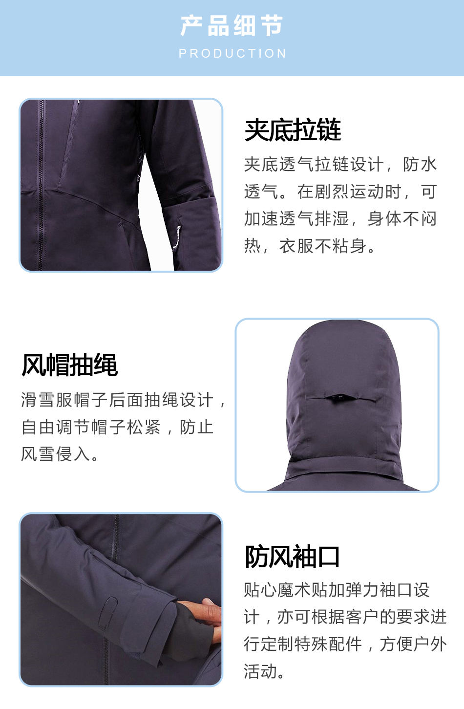 風(fēng)帽抽繩:滑雪服帽子后面抽繩設(shè)計(jì),自由調(diào)節(jié)帽子松緊,防止風(fēng)雪侵入。